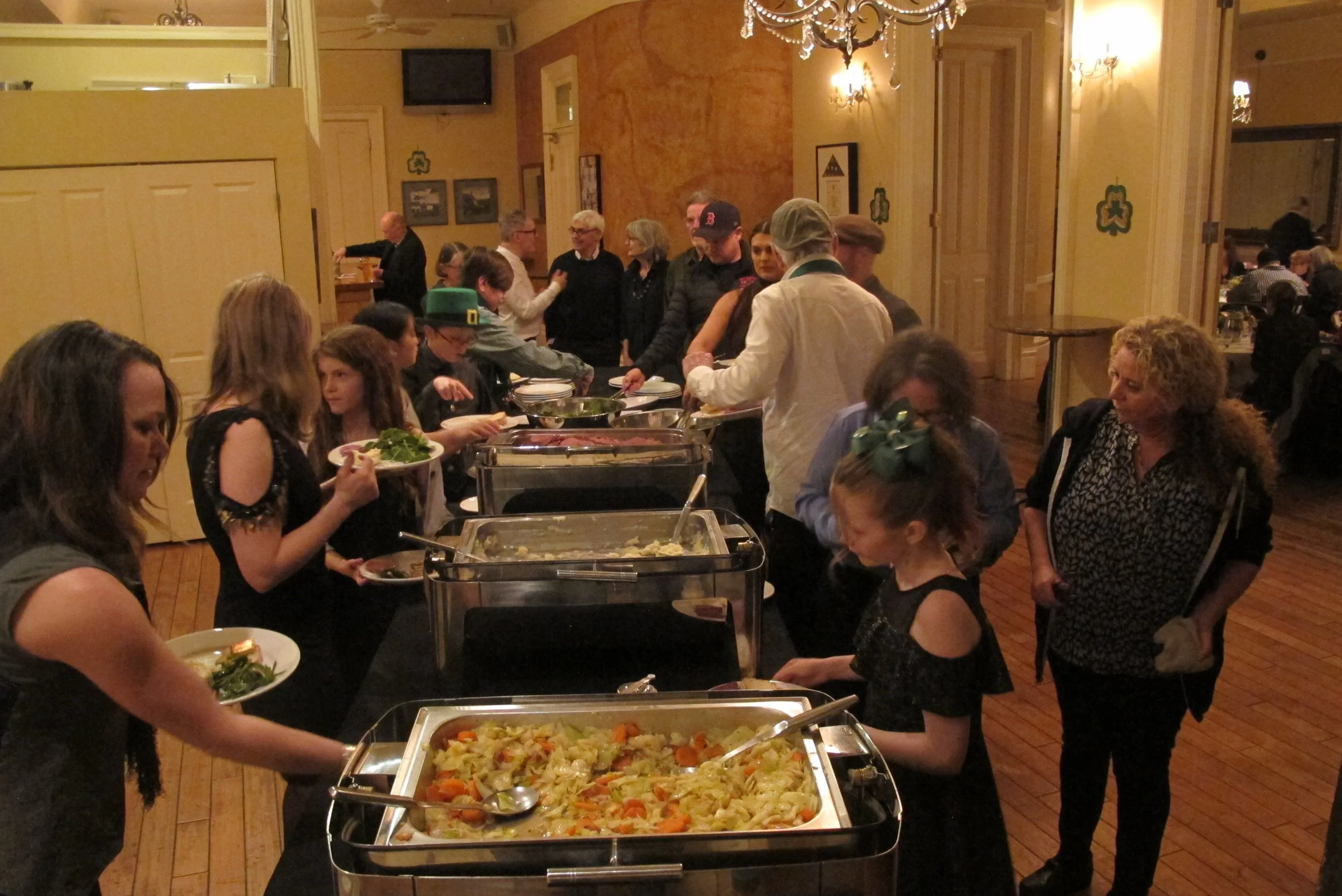 Buffet - Six Forty Five P.M. Menu - Kells salad, Delmonico potatoes, Corned Beef, Cabbage w/ bacon and carrots, Rolls, Assorted desserts. Vegetarian/vegan options available by pre-arrangement. Blessing by Jim Galluzzo.