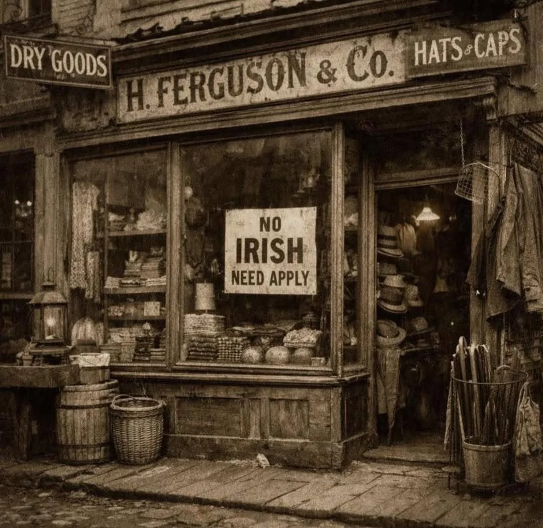 Who was H. Ferguson? That’s a Scottish Gaelic surname. Who among the Irish would spend money at a shop with anti-Irish advertising? Would a Scots-Irish immigrant like Mr. Ferguson turn down anyone’s business?