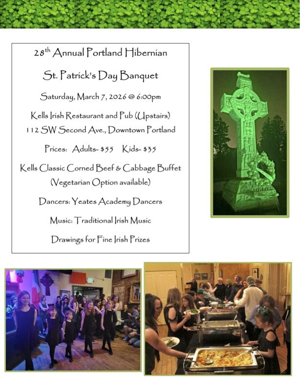 SAVE THE DATE – 31 days until the Annual Hibernian Saint Patrick’s Day Banquet upstairs at Kells. March 7, 2026. To book your place(s) at the table REPLY TO Portlandhiberniansociety@gmail.com